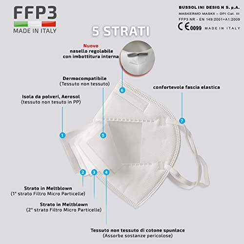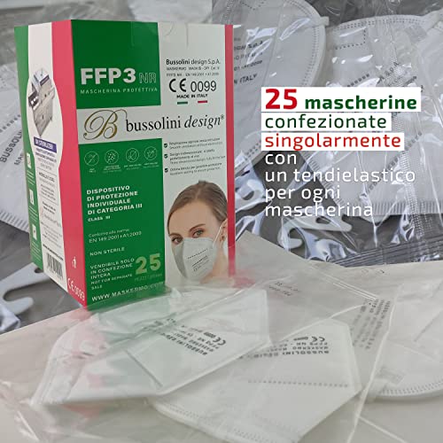 Bussolini Design 25 Mascherine FFP3 - certificate CE - Made in Italy - Sanificate con raggi UV - BFE ≥99% - Imbustate Singolarmente con un tendielastico incluso per ogni mascherina