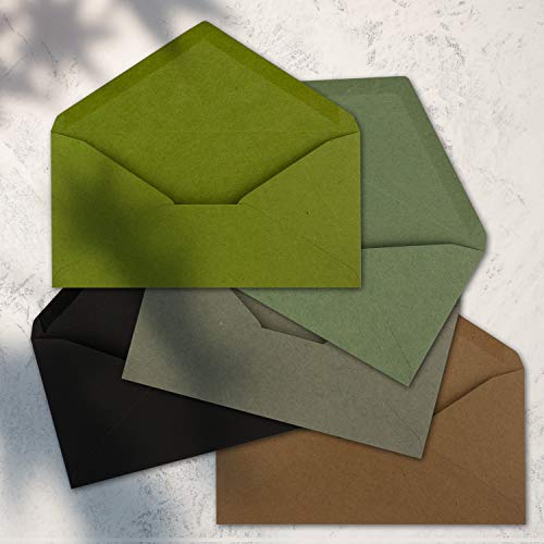 Le buste non hanno una finestra per indirizzi (senza finestra). Classica chiusura per biglietti di auguri con patta a punta da inumidire o infilare. Colori (per interni + sußen): marrone, verde, verde chiaro, grigio, nero