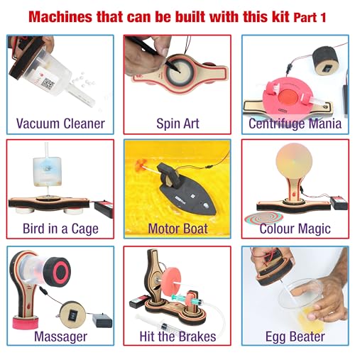 REGALO DI COMPLEANNO CREATIVO A SORPRESA - Elenco di oltre 20 progetti che puoi realizzare con il kit Macchine motore: Ventilatore da tavolo con interruttore, Mini aspirapolvere, Miscelatore statico, Crazy Bug, Illusione di animazione, Bulge of Earth, Forme 2D-3D, Centrifuge Mania, Hit i freni, il mixer dei colori, la barca a motore, facciamo delle onde !! , Lavorazione delle lame del ventilatore, motoscafo, Hover Craft, Hairy Fashion, Mini Egg Beater, Tornado Mixer, Mini Drilling Machine, Spin