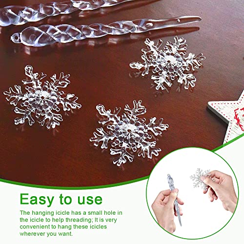 【Facile da usare】 Siamo dotati di una lenza trasparente che ti consente di infilare fiocchi di neve e ghiaccioli, ogni ciondolo ha un foro speciale, puoi infilare direttamente il cavo d'argento. 30 pezzi di ornamenti di ghiacciolo con fiocco di neve bianco in plastica inclusi 10 pezzi di ghiaccioli di Natale, 20 pezzi di fiocchi di neve. 2 diversi modelli possono soddisfare le tue diverse esigenze di decorazione.