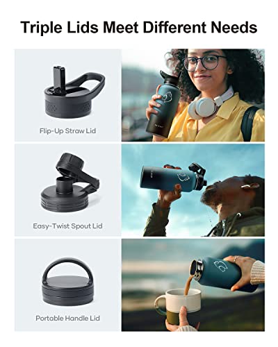 Confezione da 3 tappi, 100% a prova di perdite: la borraccia BUZIO in acciaio inossidabile viene fornita con 3 coperchi: coperchio con manico portatile, coperchio con beccuccio facile da ruotare e coperchio con cannuccia ribaltabile per incontrare campeggio, escursionismo, ciclismo, sport fitness e altro ancora. Ogni coperchio ha una guarnizione ispessita a 360° per il 100% a prova di perdite.