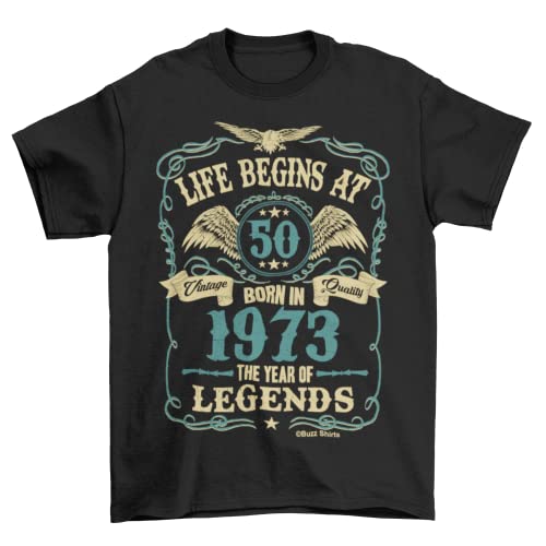 Buzz shirts Mens 50th Birthday T-Shirt, Life Begins at 50, Made from Organic Cotton, Born in 1972 (Large, Black)