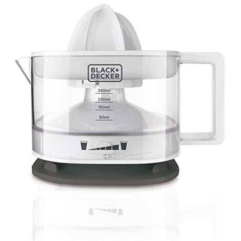 BLACK & DECKER BXCJ25E CITRUS JUICER 25W DESIGN Material Plastic Product colour Grey, Transparent, White Product type Centrifugal juicer ERGONOMICS Cord storage Y FEATURES Adjustable pulp control Y Detachable pulp container Y Dishwasher-proof parts Y Juice container Y Juice container capacity 0.35 L Number of press cones 1 Pulp container Y Reverse Y OTHER FEATURES Handle(s) Y POWER Power 25 W