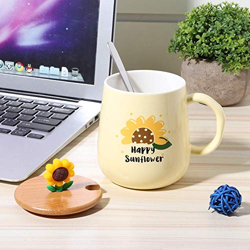 BYARSS Tazza in Ceramica, Tazza con Coperchio Ceramica,420 ml Bella Tazza in Ceramica con Cucchiaio e Coperchio Tazza da caffè per Acqua e Latte per Regalo di Bicchieri(Yellow HappySunflower,420ml,)