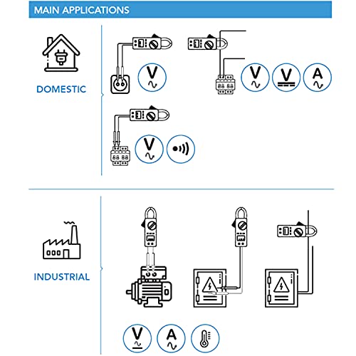 Misura di Tensione AC/DC 600V, Corrente AC 600A, Resistenza 60 MΩ, Capacità 60 mF, Frequenza (A, V, Hz, Duty) e Temperatura.