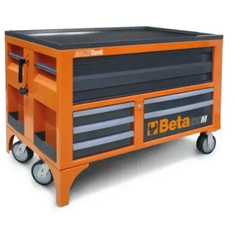 La postazione da lavoro mobile MaxiTank Beta C30M è una soluzione completa per officine e garage, comprendendo un ampio piano da lavoro, cassetti, vani e la possibilità di movimentare il tutto in maniera semplice ed agevole.Grazie a questa soluzione versatile potrete così disporre di una postazione da lavoro completa ovunque abbiate bisogno di lavorare all'interno della vostra officina, trasportando non solo i materiali ma anche un piano da lavoro completo in grado di sorreggere in totale un carico statico pari a 1800 kg.Questo banco da lavoro si compone da cinque cassetti frontali di diverse misure: 3 cassetti da 36,7x61x9 cm, un cassetto da 58,8x61x9 cm ed un cassetto da 58,8x61x18 cm. Gli stessi risultano montati su guide telescopiche a sfera e presentano un fondo protetto da tappetini in gomma espansa per prevenirne usura e danneggiamento.Questi cassetti sono compatibili con i termoformati Beta ideali per andare a completare la propria dotazione di strumenti