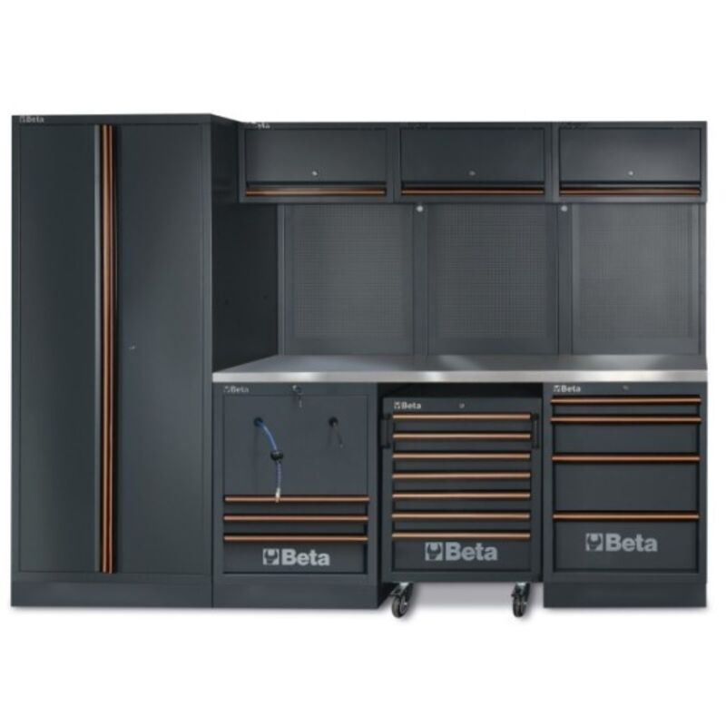 La combinazione arredo officina C45PRO HX Beta grazie alla nuova veste con colorazione ral 7016 grigio antracite e le nuove finiture opache è un prodotto estremamente accattivante ed unico nel suo genere.Studiato in ogni suo dettaglio, è caratterizzato da un design moderno conferito dalle nuove maniglie in alluminio con inserti arancioni per maggior contrasto e dai loghi Beta cromati.La serie C45PRO (Professionale, Robusto, Ordinato) è un sistema di arredamento adatto per professionisti ed hobbisti, perfetto per iniziare ad organizzare ed ottimizzare i propri spazi permettendo di operare con maggior efficienza e versatilità.Questa gamma di arredi offre elevata affidabilità grazie alla selezione di materiali robusti oltre che ai miglioramenti strutturali rispetto la precedente versione, che garantiscono massima resistenza alle sollecitazioni quotidiane solitamente dettate dai lavori di officina e laboratorio. Semplice e flessibile, la serie C45PRO permette di scegliere combinazioni