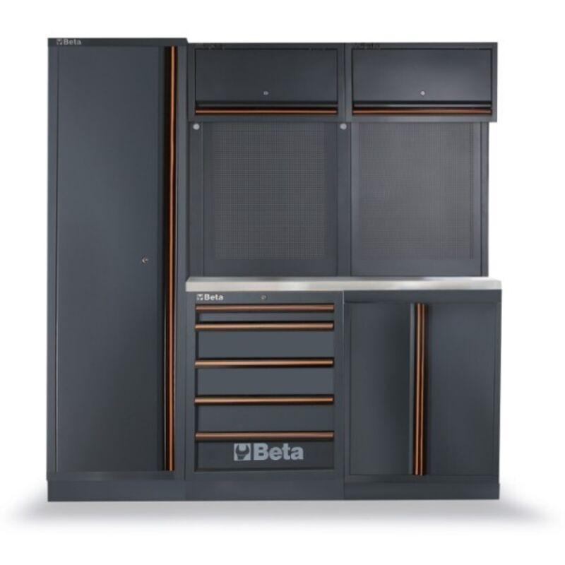 La combinazione arredo officina Beta C45PRO BX grazie alla nuova veste con colorazione ral 7016 grigio antracite e le nuove finiture opache è un prodotto estremamente accattivante ed unico nel suo genere.Studiato in ogni suo dettaglio è caratterizzato da un design moderno conferito dalle nuove maniglie in alluminio con inserti arancioni per maggior contrasto e dai loghi Beta cromati.La serie C45 PRO è un sistema di arredamento, adatto per il professionista e non, perfetto per iniziare ad organizzare ed ottimizzare i propri spazi permettendo di operare con maggior efficienza raccontando alla propria clientela del proprio modo di lavorare trasmettendo passione ed addifabilità.Questa gamma di arredi offre elevata affidabilità grazie alla selezione di materiali robusti oltre che ai miglioramenti strutturali rispetto la precedente versione, che garantiscono massima resistenza alle sollecitazioni quotidiane solitamente dettate dai lavori di officina.L'arredo C45PRO BX è realizzato con la