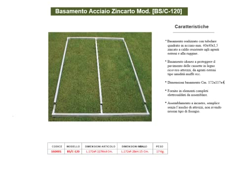 Basamento in acciaio zincato a caldo, grazie alla costruzione robusta, installato sul terreno o superficie solida, garantisce lunga durata al manufatto in legno, dimensioni articolo Cm. 172 x 117 x 4 peso Kg. 17, dimensioni imballo Cm. 172 x 28 x 15 peso Kg. 17,5.