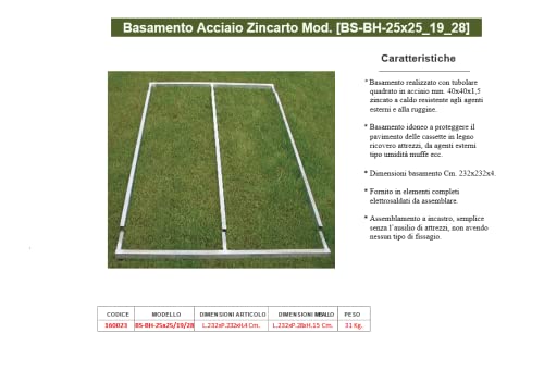 Basamento in acciaio zincato a caldo, grazie alla costruzione robusta, installato sul terreno o superficie solida, garantisce lunga durata al manufatto in legno, dimensioni articolo Cm. 232 x 232 x 4 peso Kg. 31, dimensioni imballo Cm. 232 x 28 x 15 peso Kg. 31,5.