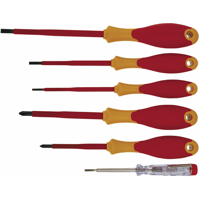 In acciaio al cromo molibdeno di alta qualità. Isolati 1000V. Impugnatura ergonomica in plastica, rivestita con materiale antiscivolo. Composizione: 5 cacciaviti (3x100 mm, 4x100 mm, 5.5x100 mm, PH1x80 mm, PH2x 100 mm), 1 tester di tensione 125-250V. In blister. 9506135933899 KONCRETO