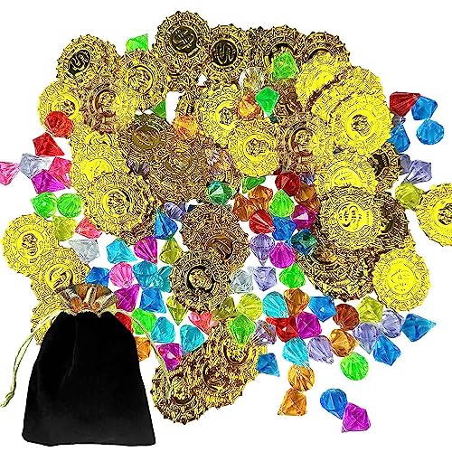 Caccia al Tesoro per Feste Compleanno,160pcs Caccia al Tesoro(60pcs Monete d'oro di Plastica +100pcs Gemme),Monete Finte per Tesoro dei Pirati,Festa di Compleanno per Bambini,Giocattoli di Halloween