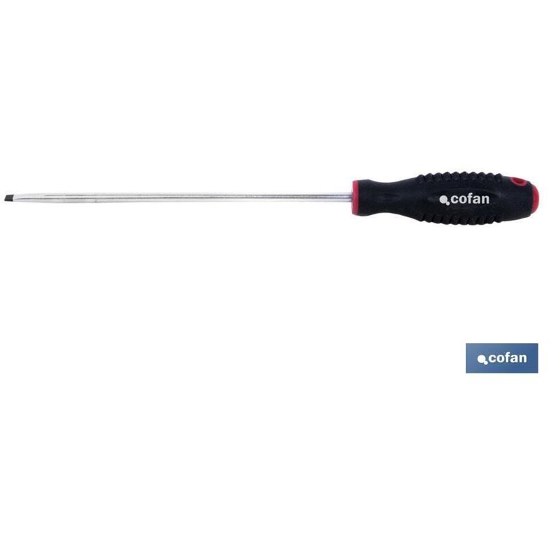 Cacciavite piatto per meccanico elettricista DIN 5265 modello Comfort plus e ingombro da 3 mm a 6 mm con lunghezza massima fino a 32 centimetri. Con una punta magnetica, componenti e parti non andranno persi. Puoi risparmiare molto tempo nell'inserimen
