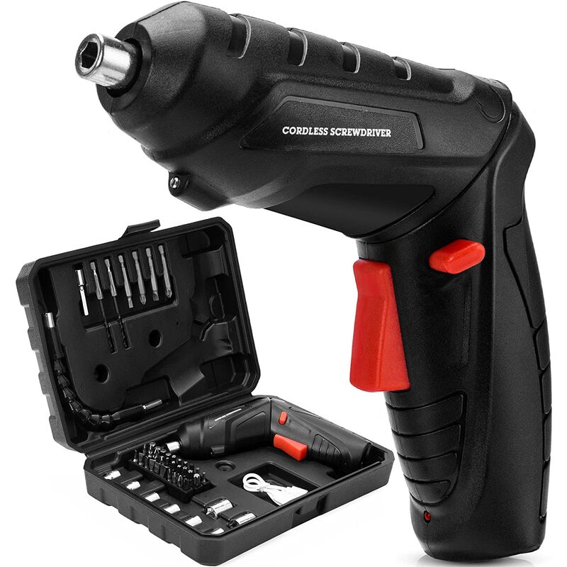 Set di cacciaviti a batteria 47 in 1: il set di cacciaviti elettrici viene fornito con una custodia per il trasporto, incluso 1 cacciavite elettrico a batteria, 30 punte per viti, 4 punte per cacciavite CR-VPH, 1 punta per trapano in acciaio 2 barre di prolunga, 8 chiavi a bussola (5 -12mm), 1 asta di perforazione estensibile, 1 cavo di ricarica USB, 1 manuale di istruzioni. I nostri trapani a batteria sono ampiamente utilizzati per assemblare e riparare mobili, attaccare immagini alle pareti interne, installare finestre e porte e realizzare scaffali fai-da-te con i tuoi bambini. Ugello magnetico e design leggero: l'avvitatore elettrico è progettato con un ugello magnetico che non si staccherà rapidamente durante l'uso. 35 punte per cacciavite possono essere sostituite a piacimento, il che è molto comodo da usare e soddisfa tutte le tue esigenze di installazione;