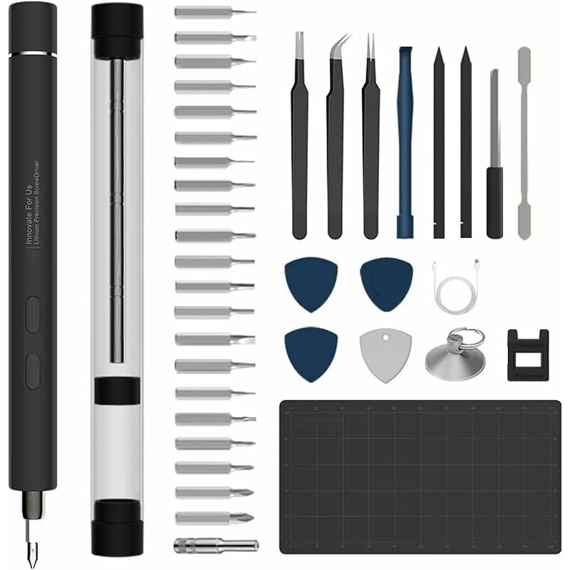 Multifunzione: 22 bit che soddisfano gli standard internazionali: inclusi Phillips, Hex, Torx, Slotted, 5 Point, Triangle, Square, Y type, U. Ampiamente usato in dispositivi elettronici come smartphone, computer, fotocamere, radio, droni, robot, orologi, occhiali, giocattoli per bambini, ecc. Ricarica rapida e lunga durata della batteria: completamente carica per 60 minuti, può funzionare ininterrottamente per più di 2 ore e durata della batteria per più di 180 giorni. L'interfaccia di ricarica USB-C universale è più conveniente. Modalità doppia efficiente: la velocità di uscita a vuoto è di 200 giri/min, modalità automatica/manuale con coppia di 0,2/3 nm Entrambe le modalità possono essere commutate liberamente per migliorare l'efficienza del lavoro . Illuminazione a 360° senza ombre: 3 luci LED integrate per un'illuminazione completa possono fornire una visione chiara al buio e semplificare notevolmente i lavori di riparazione.
