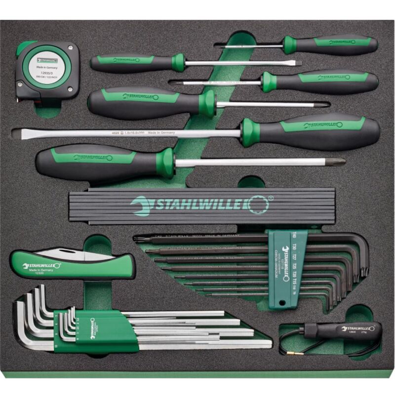 Intervallo degli strumenti nel sistema di deposito degli strumenti Sistema di controllo degli strumenti (TCS)-Sicurezza integrata • Per il sistema di controllo degli strumenti, gli strumenti si trovano in inserti in schiuma di sicurezza resistenti alle sostanze chimiche con ritagli tridimensionali ad alta precisione. • Area del segnale colorato. Per controllare la completezza, uno sguardo è sufficiente: colore significa che non esiste uno strumento. Contenuto, 40 parti