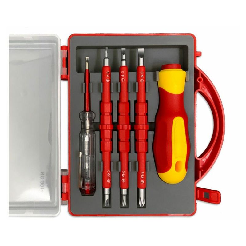 Questo è un set di strumenti di manutenzione professionale per gli elettricisti per eseguire diversi tipi di lavori elettrici o altri lavori di riparazione. Non importa se esegui riparazioni elettriche o solo riparazioni quotidiane in generale, questo set è un must per qualsiasi cassetta degli attrezzi tuttofare o elettricista. Caratteristiche: Impugnatura ergonomica per il massimo comfort e una coppia eccezionale. Include diversi tipi di punte magnetiche per soddisfare le diverse esigenze di alimentazione. Design del portapenne isolato per test fino a 500 V di tensione di tenuta. Realizzato in acciaio al cromo vanadio, temprato per la massima resistenza all'usura. Design della punta Plug-pull, facile da installare e sostituire le punte, risparmio di tempo ed efficienza. Viene fornito con una custodia trasparente, comoda per la conservazione e portatile per l'uso. Caratteristiche: Materiale: acciaio al cromo-vanadio (6150 CR-V) + PP + TPR Uso adatto: per aria condizionata