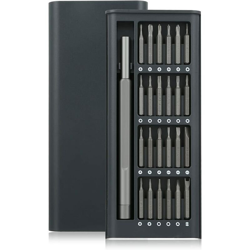 MATERIALI - Cacciaviti magnetici realizzati in acciaio CRV di alta qualità e l'impugnatura magnetica è in lega di alluminio, robusta e durevole. Un rigoroso controllo di qualità garantisce l'elevata precisione delle punte del cacciavite. SET COMPLETO - Kit di cacciaviti di riparazione portatili. Include 24 punte per cacciavite (punte Phillips, punte torx, punte esagonali ecc.) e 1 impugnatura magnetica. PORTATILE - Tutti gli accessori sono conservati in una scatola di plastica appositamente progettata, piccola e leggera per un facile trasporto e mantiene tutto ordinato e organizzato. DESIGN MAGNETICO - La testa dell'impugnatura del cacciavite ha un magnetismo. Devi solo scegliere la punta che ti serve e inserirla nel foro della maniglia, e la punta verrà aspirata saldamente a causa del magnetismo. AMPIO UTILIZZO - Questo set di cacciaviti di precisione può essere ampiamente utilizzato per riparare e smontare vari dispositivi elettronici ed elettrodomestici con piccole viti come