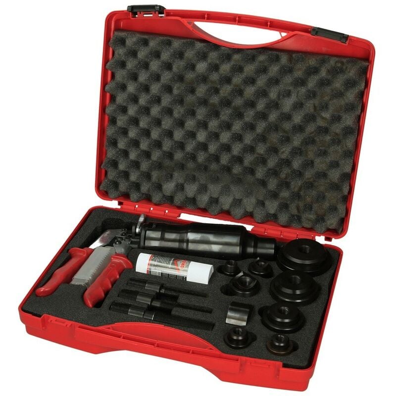 Il cacciavite gioco è ideale per i produttori di elettrodomestici elettrici, per elettricisti, installatori industriali e commerciali. È adatto per la punzonatura di metalli non ferrosi e leggeri, piastre in acciaio, piatti in acciaio inox e plastiche. I materiali a parete sottile possono essere perforati rapidamente, senza sforzo, pulito e senza bavour in pochi passi. Il pratico e pratico caso contiene otto dimensioni comuni di fori a vite. Grazie al supporto ottimale del taglio a 3 punti, vi è pochissima deformazione dei pezzi tagliati. Ciò impedisce danni al bullone di trazione. prima di utilizzare il foro a vite, il bullone di trazione deve essere lubrificata con uno spray o una pasta di taglio. Ciò riduce l'usura e aumenta la vita. La flebo metrica ha la classe di altissima qualità ed è quindi progettata per carichi estremi. in caso di perdita, può essere sostituito da viti metriche standard con filettatura fine, anche per uso a breve termine. È particolarmente indicato per l'uso