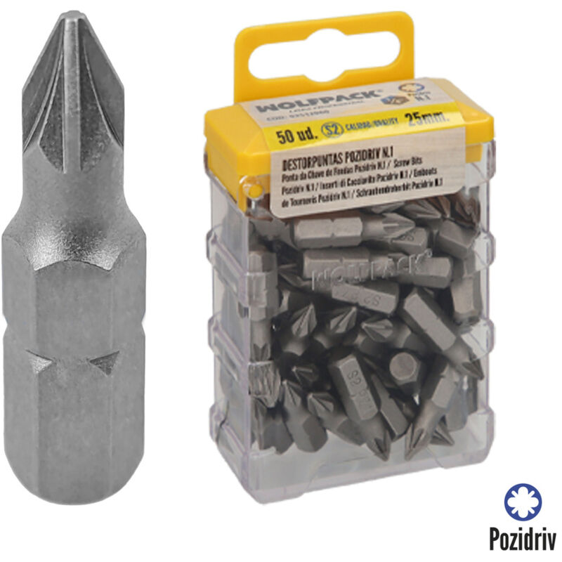 Punte per cacciavite Pozidriv - Bussola n. 1. - Bussola Pozidriv. - Punte rettificate, riducono al minimo il rischio di rottura. - Realizzati in acciaio al cromo vanadio s2, fornendo una durezza massima. - 50 pezzi. - Articolo noto come punte per cacciavite, punte per cacciavite esagonali.