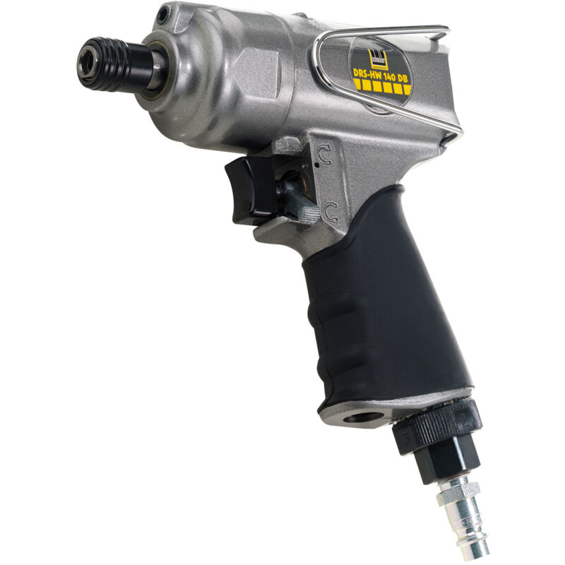 Strumento molto potente con meccanismo a doppio impatto Ideale per avvitare in falegnameria e carpenteria Attacco esagonale da 1/4 (6,35 mm) Rotazione destra/sinistra con cambio rapido In un mini-sistemario Portabit magnetico, 4 bit Dati tecnici Fabbisogno d'aria 420 l/min Coppia max. 100 Nm Velocità 11500 min-1 Peso 1 kg Pressione di lavoro 6,3 bar