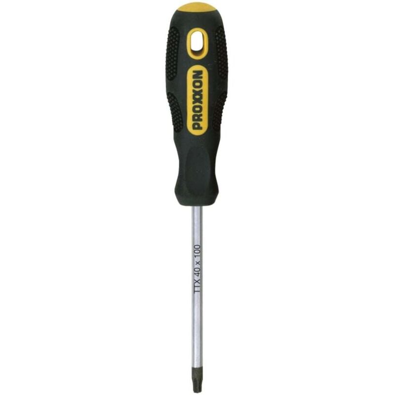 Cacciavite TTX-Tamper-Torx (con foro frontale) 8x75 mm PROXXON modello 22230 Ottima presa istantanea Consente l'applicazione di elevati valori di coppia e di pressione con un disegno bilanciato sia in posizione orizzontale sia in posizione verticale Simbolo del tipo di lama e dimensione indicati sul cappuccio dell'impugnatura per una sicura identificazione Foro trasversale per appendere o inserire una leva Impugnatura in gomma speciale antiolio e antiacido su cui lo sporco non aderisce Incavi per le dita maggiore presa in fase di ruotazione veloce Chiara marcatura al laser delle dimensioni su lame in acciaio speciale bonificato al Cromo-Silicio-Manganese-Molibdeno Tempera passante priva di tensioni interne Un rapporto bilanciato tra resistenza alla torsione e durata Punta nera rettificata per la massima precisione nella presa della vite Diminuisce le possibilità di slittamento dell'utensile DIMENSIONI: TTX: 8 Lunghezza leva: 75 mm Lunghezza manico: 75 mm "