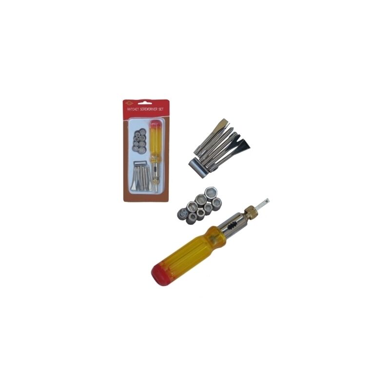 Cacciavite porta utensili a cricchetto reversibile, manico antiscivolo. In dotazione: - 8 bussole - 7 inserti misti (esagonale, torx, flat, croce, piatto, punta biforcuta)