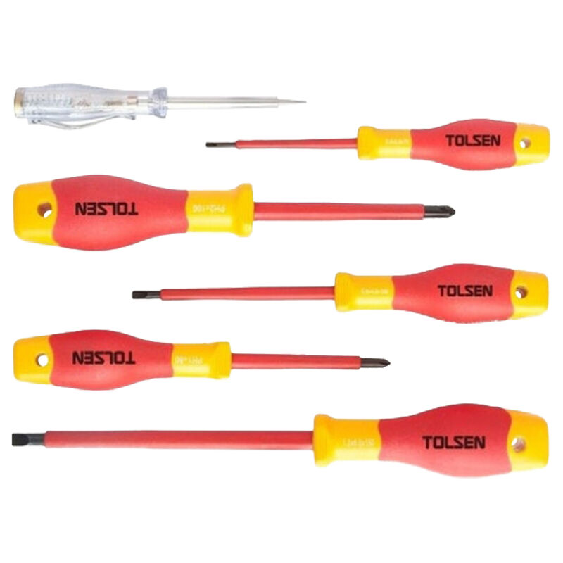 Set di 6 cacciaviti della linea di utensili isolati Premium VDE Line di TOLSEN. Utensili professionali prodotti secondo la normativa DIN EN 60900. Contenuto della confezione: 1x Cacciavite fisso isolato 0.4 x 2.5 x 75 mm 1x Cacciavite fisso isolato 0.8 x 4.0 x 100 mm 1x Cacciavite fisso isolato 1.0 x 5.5 x 125 mm 1x Cacciavite Phillips isolato PH1 x 80 mm 1x Cacciavite Phillips isolato PH2 x 100 mm 1x Tester di tensione 3.0 x 70 mm