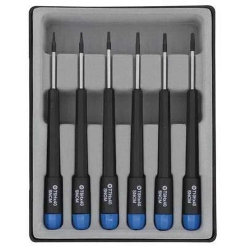Dettagli tecnici Forza Esalobo Interno (TX) Indicazione di quantità (solo per elementi - LOV) 6 parti Profilo a T con foro interno Set cacciaviti 6 pz Cacciavite di precisione di alta qualità con punte temprate in nichel-cromo-molibdeno di qualità con punta nera e codifica a colori Calotta argentata girevole per inserimento rapido e semplice (delle torsioni rapide). Impugnatura in poliammide (PA6). Profilo a T con foro interno T5/T6/T7/T8/T9/T10. Lunghezza lama 40 mm. Testo tradotto automaticamente. Incluso nella consegna null Requisiti di sistema null