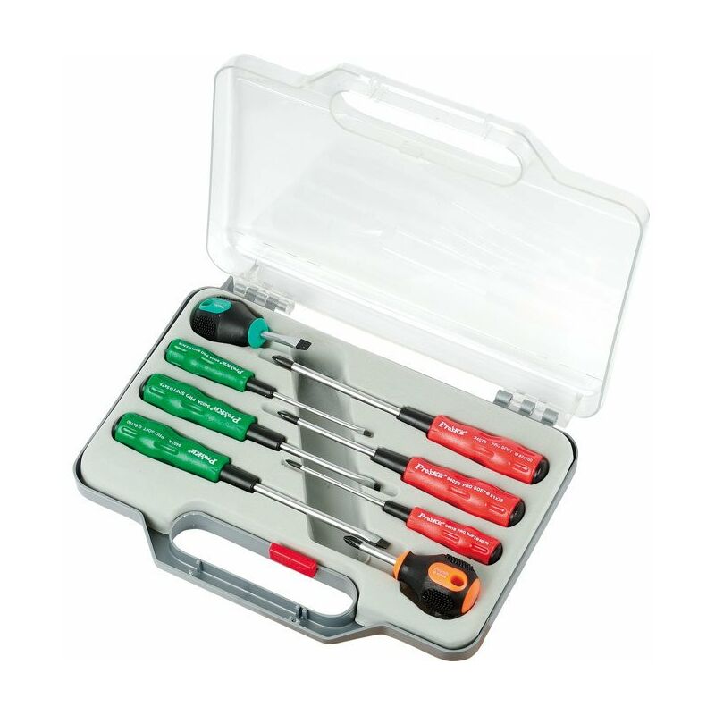 Set di cacciaviti 8 pezzi Set di cacciaviti professionali per applicazioni elettroniche. Impugnatura in polipropilene e albero inserito in modo sicuro e duraturo per un'elevata capacità di coppia. Lama in acciaio al cromo-vanadio AISI6150 di alta qualità con punta nera. Compresi: DES001, DES002, DES005, DES006, DES011, DES012, DES019, DES020 Lunghezze delle aste da 160 mm a 360 mm
