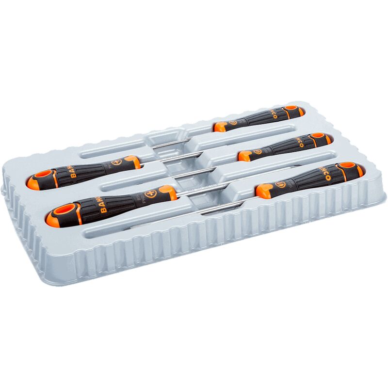 Bahco - Set di 5 cacciaviti BahcoFit con impugnatura in gomma - B219.005 - Contiene 5 cacciaviti - Vite a taglio: 0,5 x 3,0 x 75, 0,8 x 4,0 x 100, 1 x 5,5 x 125 mm - Phillips: PH1 x 100, PH2 x 125 mm - Punta rifinita al fosfato per una migliore precisione - Impugnatura bi-materiale con scanalature verticali e ampia area di presa confortevole con elevato trasferimento di coppia - Simbolo indelebile e marcature sul manico per una rapida identificazione della punta - Foro di sospensione integrato - Lama in acciaio ad alte prestazioni con cromatura per un'elevata protezione dalla corrosione Strumento di lunga durata - Confezionato in una scatola di cartone - Comodo da usare grazie all'impugnatura bicomponente con oltre il 75% di gomma - Presa ottimale grazie alle scanalature verticali antiscivolo sul manico - Facile identificazione della dimensione e del tipo di vite grazie alle marcature incise nel manico Dati tecnici: Numero di cacciaviti: 5 Peso: 355 g Composizione: - Cacciaviti a