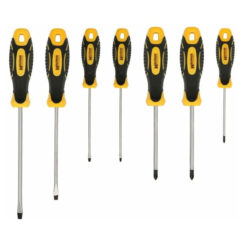 Set di cacciaviti da 7 pezzi - Il set comprende cacciaviti con: > 3 prese Phillips da 0x75/1x100/2x100 mm. > 4 prese stampate da 3x100/4x100/5x125/6x150. - Realizzato in acciaio al cromo vanadio. - Impugnatura bimateriale con scanalature, per una migliore presa. - Ideale per lavori industriali. - Articolo noto come set di cacciaviti, cacciaviti piatti, cacciaviti a stella, set di cacciaviti assortiti, ecc.