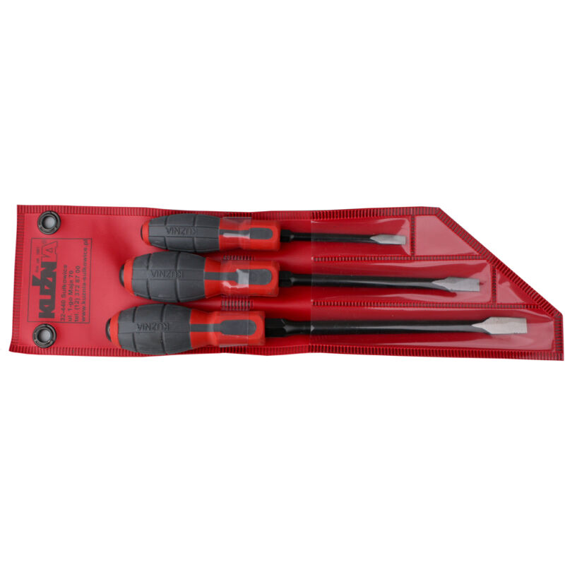Set di 3 cacciaviti piatti in acciaio per utensili, superfici annerite, manico in plastica, punta su tutta la lunghezza del manico per forare, con 6 punte per supportare il lavoro con chiave