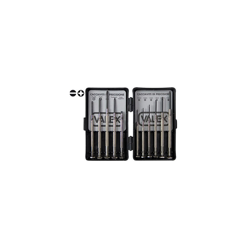 CACCIAVITI DI PRECISIONE PER VITI CON INTAGLIO E PHILLIPS SERIE 11 PZ. 6 cacciaviti per viti con intaglio 0,9-1,2-1,4-1,8-2,4-3,0mm, 3 cacciaviti phillips PH00-PH0-PH1, 1 punteruolo, 1 punta magnetica - Lunghezza da 73 a 108mm - Lama in acciaio - Punta brunita - Terminale girevole per avvitamenti di precisione.
