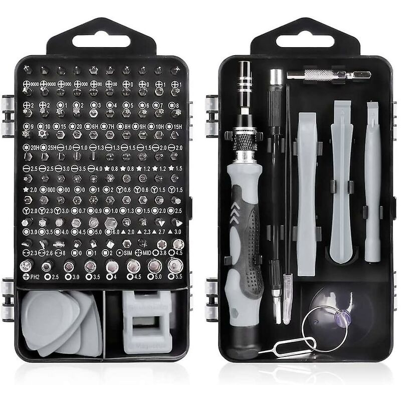 Set di cacciaviti di precisione 115 in 1: il set di cacciaviti 115 in 1 può essere utilizzato per riparare elettrodomestici comuni, come TV, condizionatori d'aria, ventilatori, frigoriferi, automobili, ecc. È inoltre necessario per lo smontaggio e la manutenzione di telefoni cellulari, fotocamere digitali, orologi, occhiali e console di gioco per laptop. Gamma completa di punte per cacciavite in acciaio CR-V: 98 pezzi di punte per cacciavite sono realizzate in acciaio al cromo vanadio di alta qualità, che è più robusto e durevole. La durezza della testa al cromo vanadio è 55-60 HRC, che fornisce un uso preciso e stabile a lungo termine. Magnete a vite: i cacciaviti di precisione magnetici possono facilmente attaccare la punta e rimuovere la vite, risparmiando tempo e fatica. Il kit di cacciaviti di riparazione viene fornito con un pad di memoria magnetico, che può essere rimosso e assemblato facilmente ed efficacemente senza preoccuparsi di perdere piccole viti precise o