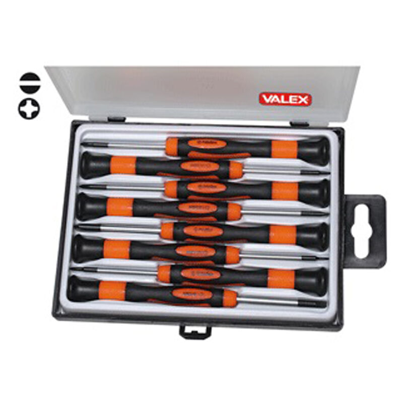 Descrizione 4 cacciaviti per viti con intaglio 1,4-2-3-4mm, 4 cacciaviti phillips PH000-PH00-PH0-PH1. Lunghezza 150mm Hanno una lama in acciaio cromo vanadio, la Punta brunita, un Impugnatura ergonomica bimateriale con dimensioni indicate e il terminale girevole per avvitamenti di precisione.