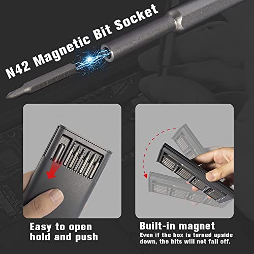 【Design magnetico】 Il design magnetico lo rende molto più facile da usare e ti offre un'esperienza di utilizzo straordinaria. Ti consente di smontare e rimontare facilmente i bit. Devi solo scegliere la punta di cui hai bisogno e inserirla nel foro del manico, e la punta verrà risucchiata saldamente a causa del magnetismo.