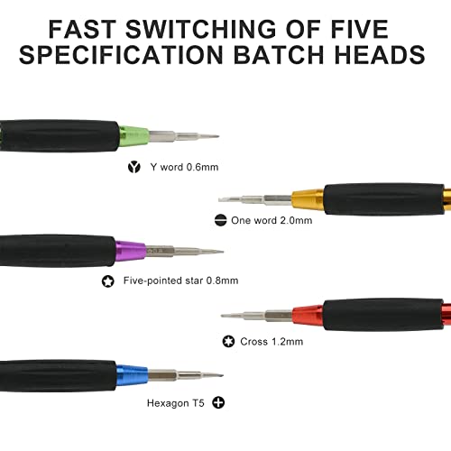【5 tipi di dimensioni】Il kit di strumenti di riparazione fornisce 5 tipi diversi: +1,5, -2,0, T5,Y0,6, ★ 0.8. le diverse dimensioni della punta di riparazione del cacciavite offre più scelte di dimensione mentre si ripara il telefono cellulare, occhiali o orologi