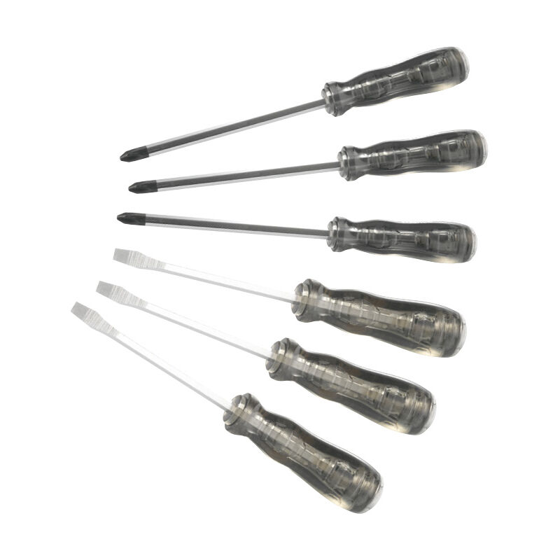 Dettagli: Set di 6 cacciaviti in acetato. Ottima ergonomia. 3 cacciaviti a taglio: 4x100 - 6x150 - 8x1753 5x150 - 8x1753 Cacciaviti a croce: 1x100 - 2x100 - 3x100 Caratteristiche: Contenitore: Scatola Numero di pezzi: 6