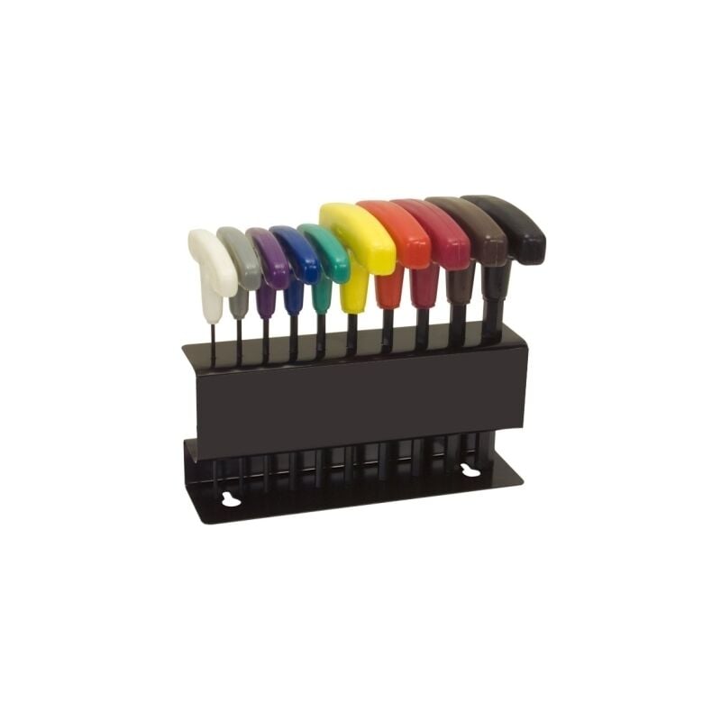 Completamente trattati termicamente, impugnatura a t per fornire una maggiore coppia, maniglie in plastica stampate. Completo di supporto in metallo pesante, applicabile a muro o a banco.