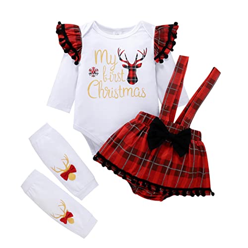 Cachi 2 Pezzi la Gonna di Natale della neonata equipaggia Il Mio Primo Pagliaccetto di Natale + Gonna con Bretelle Scozzese Rossa Abiti Natalizi per Ragazze Costume Partito Vestito Natale Principessa