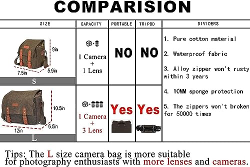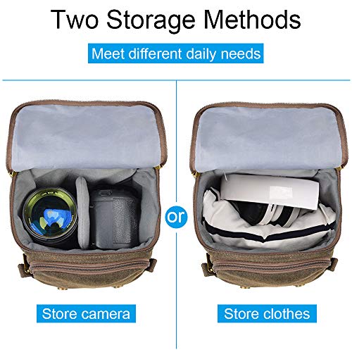 [Capacità] Dimensioni: 7,5 x 4,9 x 9 pollici. Dimensioni della tasca interna: 5,9 x 4,72 x 6,69 pollici. Questa borsa a tracolla compatta per fotocamere in tela si adatta a 1 DSLR + 1 obiettivo + telefono + accessori. Estrarre la tasca interna, può essere utilizzata come borsa a tracolla da viaggio retrò.
