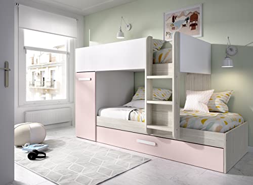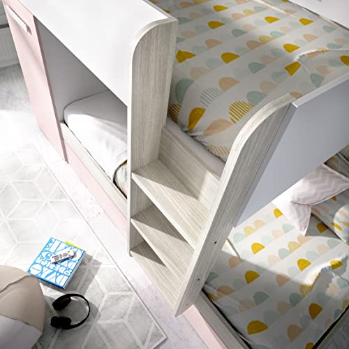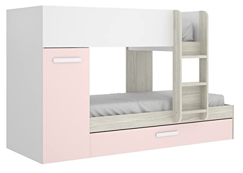 CAESAROO Letto a castello Crystal per due bambini Bianco opaco Rosa e Rovere grigio con armadio - Bianco, rosa e grigio