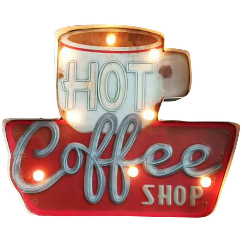 Caratteristiche: Cartello decorativo da parete in metallo per caffetteria, bar, cucina, ristorante, ecc., Per creare un'atmosfera romantica. Con l'ispirazione nostalgica della caffetteria, questo segno emana la perfetta atmosfera vintage. Con una finitura molto rustica e un design retro da caffetteria, questa insegna e un classico istantaneo. Questa decorazione robusta ma leggera e realizzata in materiale metallico goffrato, con fori posteriori, facile da appendere alla parete. Progettato con luci a LED, puoi accendere la luce di notte tramite l'interruttore, alimentato da 2 batterie AAA (non incluse). Specifiche: Alimentato: 2 batterie AAA (non incluse) Lista imballaggio: 1 * Segno di decorazione