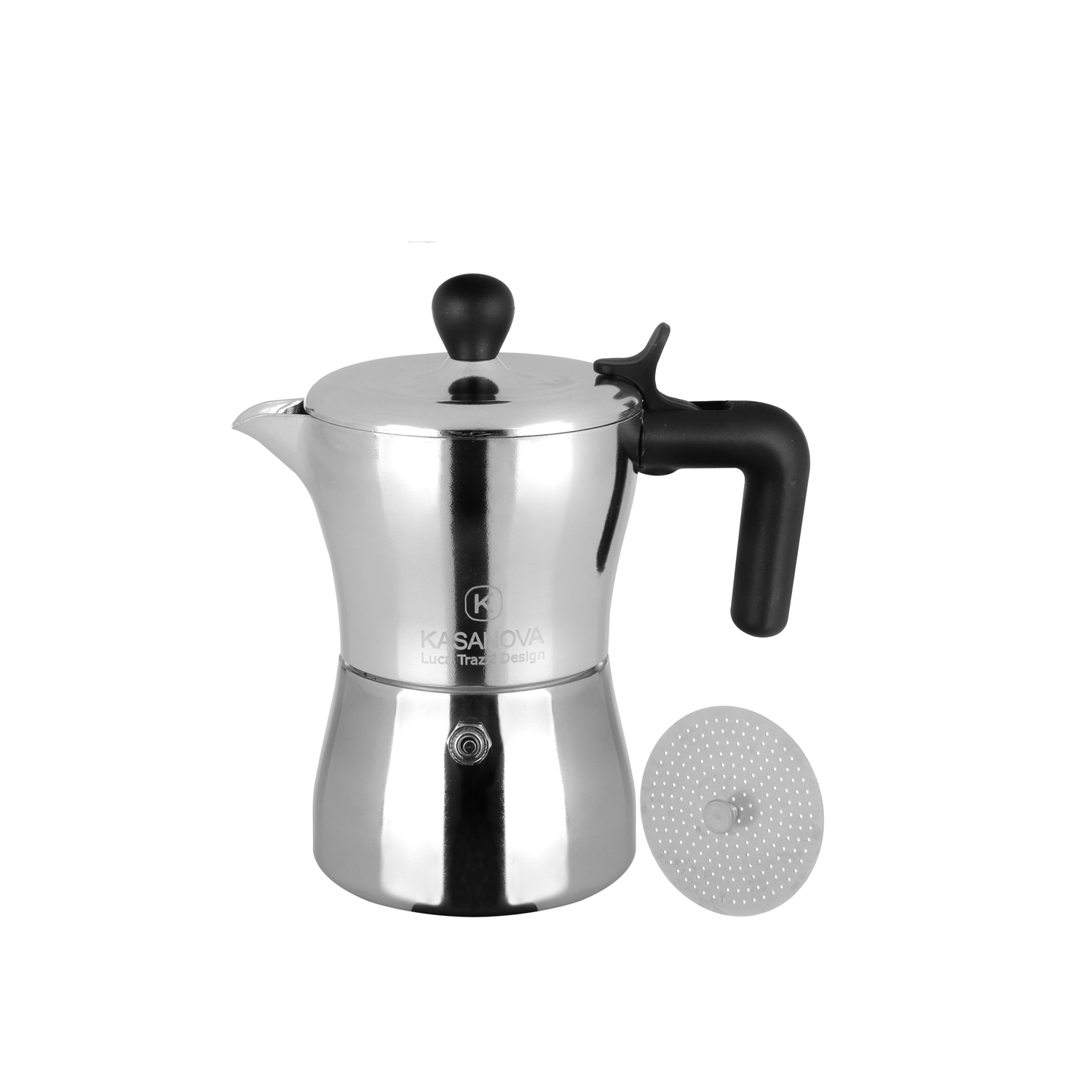 Completa la tua cucina con il design senza tempo di K-Line, la linea progettata dal designer Luca Trazzi per . Inizia la giornata con la carica giusta e assapora il piacere di preparare il vero caffè italiano con questa caffettiera in alluminio dal design moderno e dalle forme sinuose. Grazie alle caratteristiche distintive dell'alluminio, l'acqua arriva alla giusta temperatura rapidamente e senza il rischio che il caffè sappia di bruciato. Lo speciale filtro riduttore in dotazione permette di avere in cucina due caffettiere al posto di una: in base alle necessità, puoi preparare 1 o 3 tazze, erogando la quantità di caffè che vuoi. La valvola di sicurezza italiana controllata al 100% assicura un equilibrio di pressione ideale per preparare il vero espresso aromatico italiano. Grazie al manico con rivestimento soft touch, puoi afferrarla in tutta sicurezza e il beccuccio salvagoccia è studiato per evitare sprechi. Utilizzabile su tutti i piani cottura, anche a induzione.