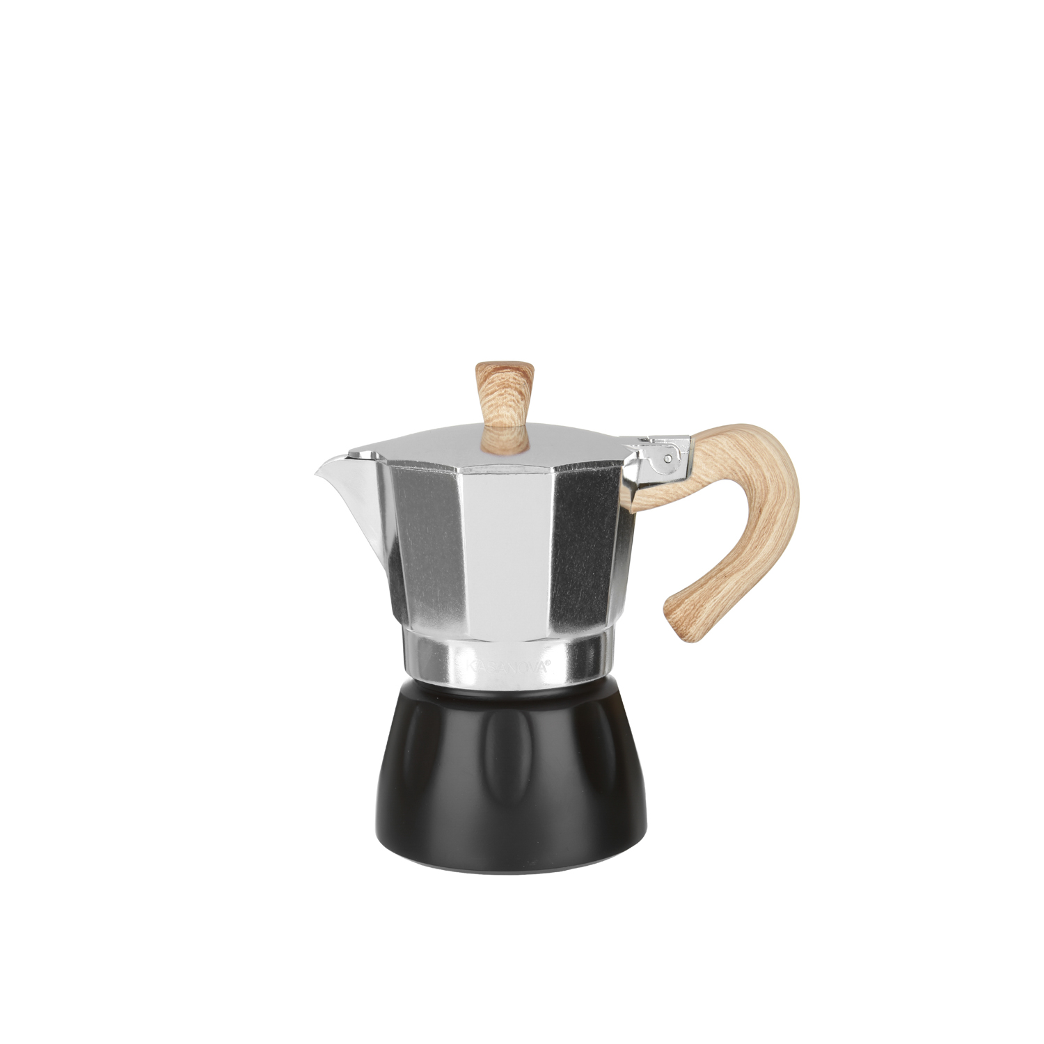 Se non sai rinunciare alla tua dose di caffeina quotidiana, ciò che ti serve è una pratica caffettiera come questa. Il corpo in lega di alluminio diffonde il calore in modo rapido e omogeneo e mantiene il tuo caffè al caldo fino al momento di versarlo nella tazzina. Il design è caratterizzato da un'estetica piacevole: l'alluminio argento si contrappone con armonia al fondo nero e agli inserti effetto legno di pomolo e manico. Il fondo della caffettiera è compatibile con i piani cottura a gas, elettrici, alogeni e in vetroceramica. Non usare sull'induzione. La caffettiera è adatta per preparare 2 tazze.