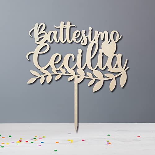 DPE - Cake topper BATTESIMO personalizzabile con nome in legno o in plexiglass. Decorazione per torte.