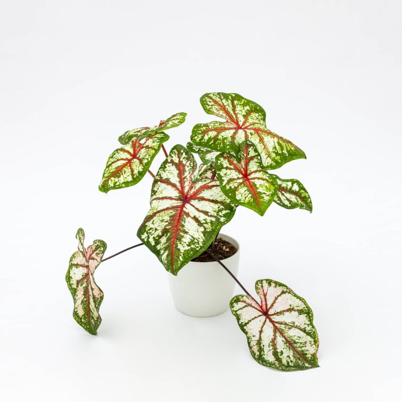 La pianta di Caladium "Tapestry" è una pianta d'appartamento proveniente dalle foreste tropicali del Sud America, con rizoma tuberoso e foglie a forma di cuore, sorrette da lunghi piccioli che si originano dal rizoma. Il fogliame è decorato con vene da rosa brillante a rosso e con macchie verdi scure sul bordo esterno, mentre il centro è chiaro e luminoso. Produce infiorescenze simili a quelle della Calla. Se coltivata all'esterno si utilizza come annuale. Preferisce ricevere luce indiretta o essere sistemate in zone di ombra parziale. Annaffiatura: mantenere il terreno umido, evitando i ristagni idrici, frequenti vaporizzazioniTerreno: morbido e drenante, in vaso usare un substrato specifico per piante da appartamento con inerti drenanti (da preferire ONE PLUS, oppure ONE e Florenpot)Concimazione: 2 volte al mese somministrare del concime liquido per piante verdi (primavera ed estate)Riproduzione: divisione dei rizomi, seme Pianta venduta in vaso di coltivazione in plastica. Il