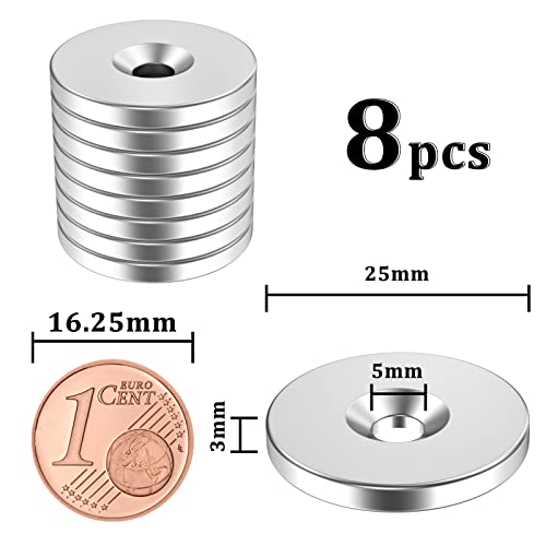 MIN CI Calamite Potenti Magnete Circolare con Foro Svasato,Calamita Neodimio 25x3mm M5 Magneti Piccole Rotonde Forati Vite Rondelle Base per Frigorifero 8 pezzi