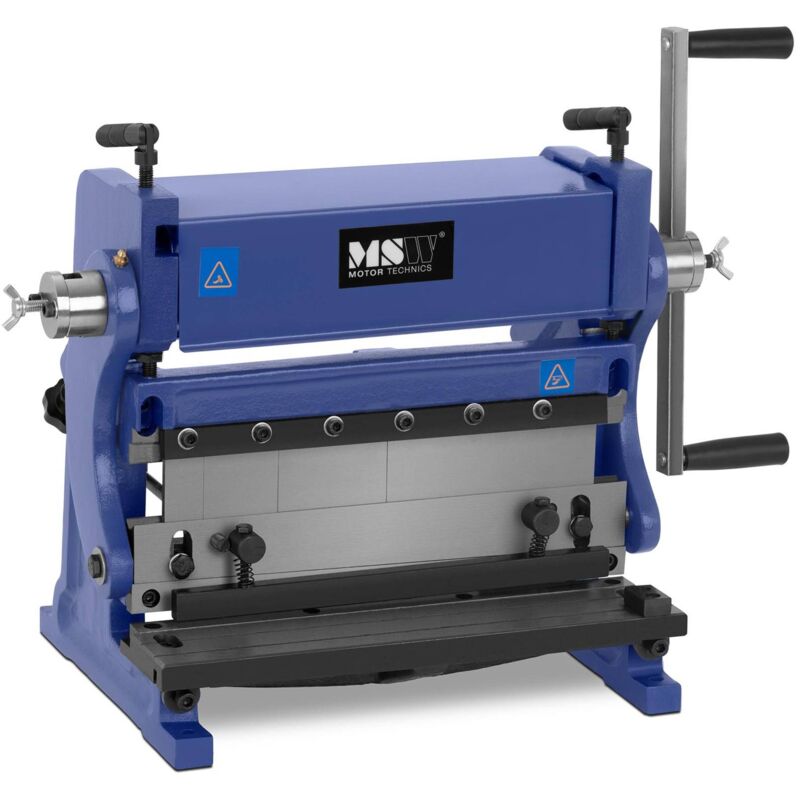 Calandra manuale MSW-MFM-3IN1-305 di MSW La piegatrice manuale 3 in 1 MSW-MFM-3IN1-305 lavora in mondo affidabile lamiere di metallo che devono essere piegate o tagliate. Per la produzione di cilindri e tubi, presenta una pressa a rulli che può piegare diversi metalli in acciaio, alluminio, rame oppure ottone. Inoltre, le matrici sono integrate nel dispositivo, con queste è possibile punzonare le piegature e, in caso di necessità, possono essere tagliate lamiere o barre di metallo. La calandra manuale di MSW è costituita da tre rulli in acciaio. Con l'aiuto di una manovella è possibile tirare e piegare lamiere o barre di metallo con uno spessore massimo di 1 mm. Per deformare le barre, sono presenti sul bordo del rullo delle depressioni con un diametro di 3,18 mm, 4,36 mm e 5,16 mm A seconda del materiale e della curvatura desiderata, è possibile regolare la distanza e l'angolo dei rulli. La larghezza massima delle lamiere non deve superare i 305 mm. La calandra manuale è adatta per